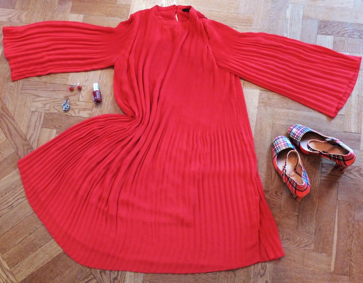 Då skorna sticker ut har jag en enkel klänning och lite roliga svarta nätstrumpor från Carlzedonia i Täby centrum – med mönster blir inte outfiten lika svart! Smycken till outfiten blir ett par örhängen i form av guldlöv från designtorget. Ringen är en trettioårspresent som är designad av en guldsmed på butiken Guldbros i Vasastan. Till det kommer jag att ha orangeröda läppar i matt ton från Bobbi Brown som jag köpt på Åhléns. Alla passar i rött läppstift, det gäller bara att hitta rätt röd nyans. Jag som är blond passar i rött som går mot orange.