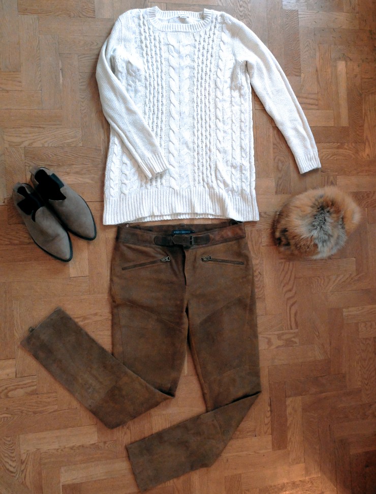 Byxorna som är mellan skinn och mocka sprang jag på när jag besökte Ralph Laurens utförsäljning för några år sedan och tröjan i cashmire, lamull, viscose och angora – är köpt vid ett annat tillfälle på Club Monaco. Bootsen är från en provkollektion från Selected femme och de har också hängt med ett tag. Tyvärr råkade jag riva sönder byxorna framme på låret – men vi har en duktig kräddare som ”nästan” trollade bort det!