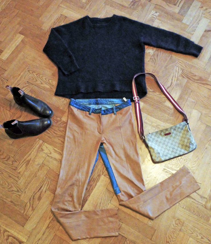 Mina skinnbyxor gick sönder och solglasögonen av ett dyrt designermärke flög av och försvann. Byxorna låg länge i min garderob men jag kunde inte förmå mig att slänga dom. Efter ett tag kom jag på idén att man kanske kunde para ihop dom med ett par gamla Acne jeans som också var trasiga. Med hjälp av en mamma som kan sy och en skräddare på Malta blev det ett par nya byxor. Dom blev supersnygga och jag har garanterat ett par byxor som ingen annan har. Till mina nygamla byxor bär jag en petroleumblå stickad tröja som jag köpte på Marlene Birger förra året. Bootsen är från RM Williams. Jag har ett par bruna också och visst de är ganska dyra – men om jag slår ut det på hur mycket jag använt dom – så var det en bra investering och de blir bara snyggare med åren. Väskan är en gammal favorit från Gucci som jag har haft i många år och tyvärr snart slitit ut. Den är perfekt storlek och väger ingenting. Jag älskar axelremsväskor för de är så praktiska och känns också lite mer sportiga!