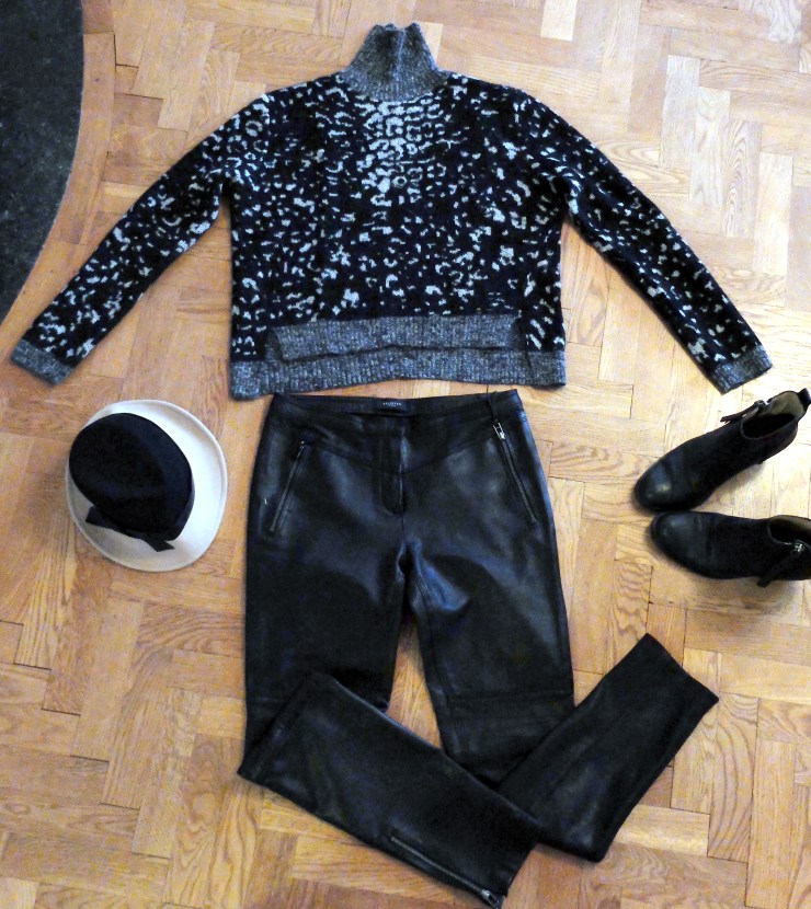 Om du vill bära skinnbyxor till vardags tycker jag att det kan vara snyggt med en stickad tröja till – för det känns lite mer avslappnat. De svarta skinnbyxorna köpte jag på rea för ett par år sedan och det var en bra investering. Märket är Selected Femme och jag klickade hem dom från nätet och hade tur som hittade rätt storlek. Tröjan på bilden köpte jag på årets julrea när jag var i Helsingfors, den är från Sand. Till just den här outfiten passar det bra med ett par gamla godingar, ”Pistol boots” från Acne som funnits i många år och som fortfarande finns i deras sortiment. Dom är sköna och har perfekt höjd på klacken och passar till det mesta. Hatten är en filthatt som jag köpt på Malta från Sandro Ferrone, Roma för några år sedan.