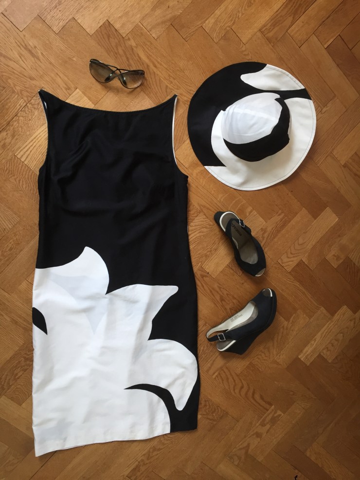 Den här klänningen köpte jag till en av mina döttrars dop. Klänningen har en klassisk Jackie Kennedy look som jag känner mig elegant i och en matchande hatt som syns i fest-minglet. Både hatt och klänning är från Marimekko. På fötterna har jag ett par svarta kilklacks skor – inköpta i New York av André Assous.